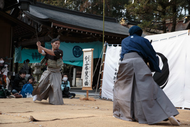 令和2年、建部大社においては時代始めの節目の総舞となりましたが、例年以上に皆さまの温かきご声援を受け無事に奉納を終える事ができました。暖冬とはいえ、厳しい寒さの中での奉納でしたが、最後までお付き合い頂きました皆様方に心よりの御礼を申し上げます。
