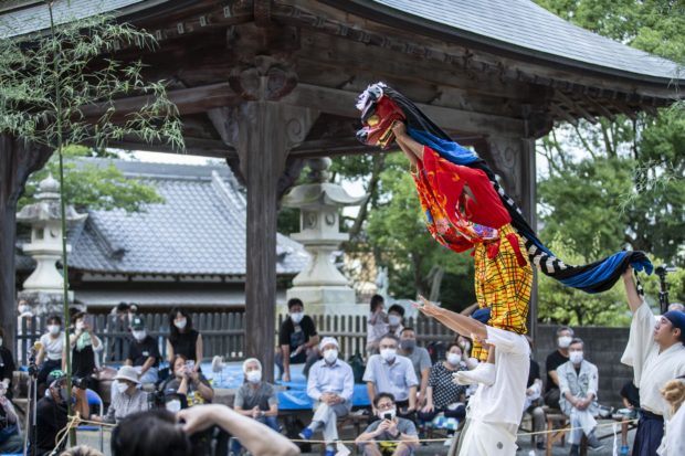 今年は泉州一円で披露して回った毬獅子の曲です。勘太夫社中においては日頃は滅多と奉納しない稀少な演目ですが、コロナも再び蔓延し大きな声で笑ったりが難しい状況下において、喜劇的演目にてどこまで笑って頂けるのか?そんな挑戦も兼ねて各所で披露致しました。