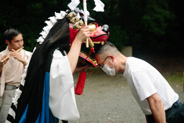 一年の厄払いの為、三百六十五歩(拾弐段)の踏み足で構成された神来舞(しぐるま)です。伊勢大神楽の大神楽師達にとって最も尊い演目と信仰され長きに渡り研鑽されてきた神楽です。四方の舞・魁曲など長く庶民に愛された演目がある中で、神来舞(拾弐段)はここ一番という節目の大奉納で奉納されており、その多くは個人宅での御祓いや御神前での特別神楽など非公開の場で実践されてきました。現代では六段の二頭舞が主流となり、江戸~明治期に栄えた十二段の一頭舞は長らく公開されておりませんでしたが、疫病蔓延に歯止めを掛けるべく、約35年ぶりに公開奉納を行いました。