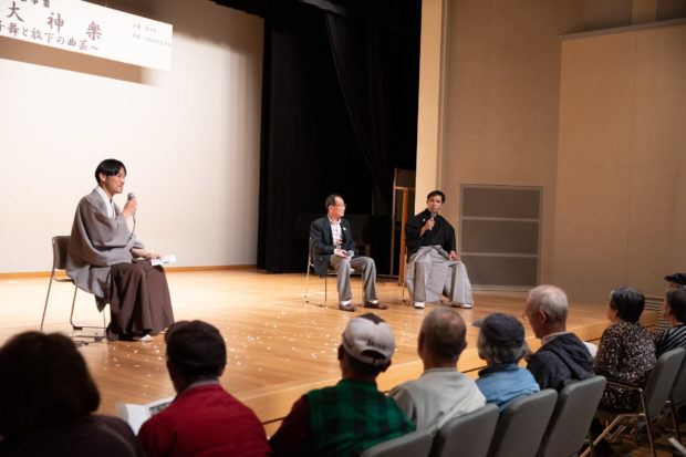 公演終了後には、和田町長・篠笛奏者 森田玲氏と共に家元 山本勘太夫が再び登壇しトークショーを行いました。かつて伊勢大神楽が忠岡の町へ訪れた際の和田町長の懐かしい思い出話や、家元が入門当時に感じた放下芸と神道の関係性など、話題は多岐に渡り大いに盛り上がりました。