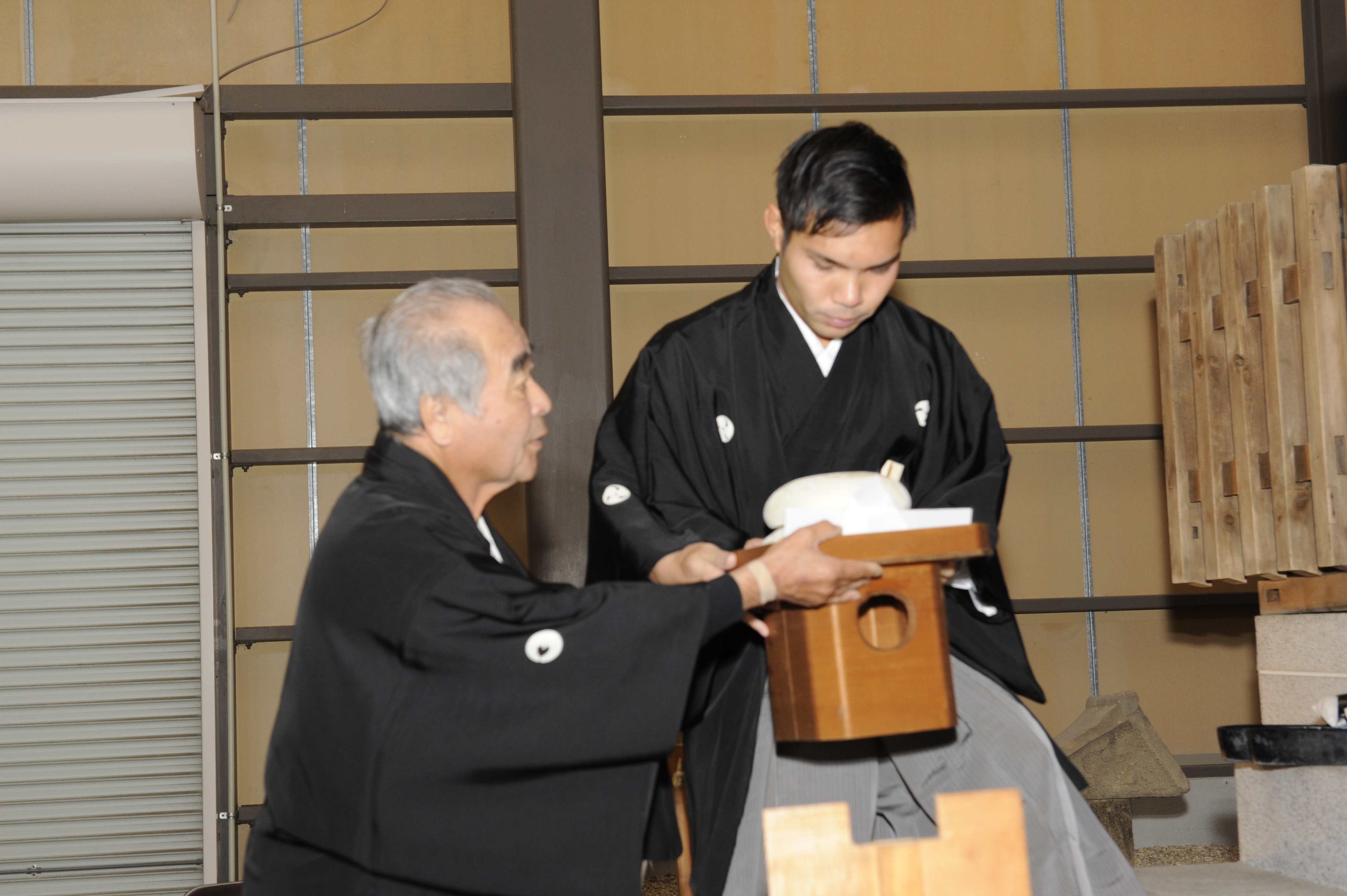 △先代太夫に代わり神講に参加する事で太夫の名跡を引き継いでいきます。(2014年山本勘太夫襲名式の様子)